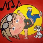 2010Breakdance jongetje. Combinatie verf en papier. Randen zijn meegeschilderd.