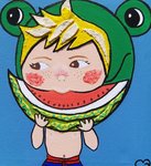 2010Benk eet een meloentje. Combinatie van verf en vilt. Randen zijn meegeschilderd.