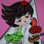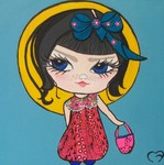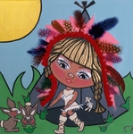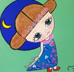 2010Kokeshi streetdancer. Combinatie van acryl, inkt, vilt, kunstwimpertjes en glitters.