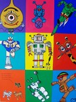 20099 Robotjes voor de kinderkamer, de middelste heeft een plastic venstertje waarachter een foto geplaatst kan worden van een kind.