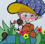 2010Tweeling in de tuin. Combinatie van verf, stof, kunstwimpertjes. Randen zijn meegeschilderd.